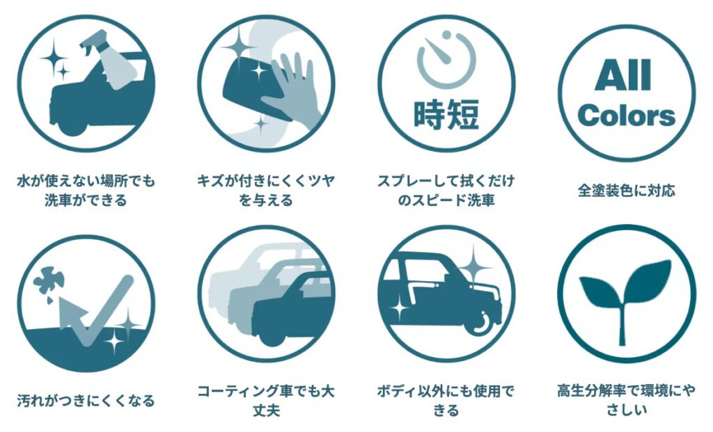繰り返し使用する事により汚れも付きにくくなり、また、水源を必要としない為、場所を選ばずにスピーディーに本格的な洗車が行えるので、自動車大国であるアメリカやオーストラリアでは、一般的な洗車方式として広く浸透しています。